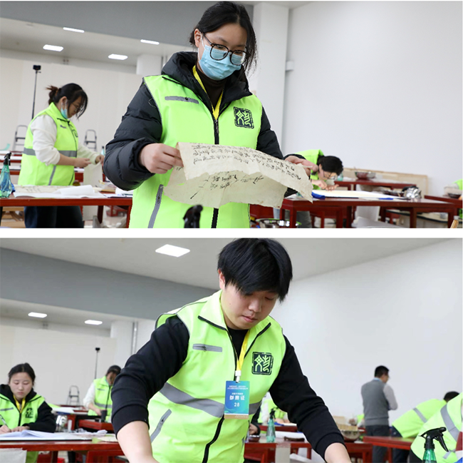 作为江苏省古籍修复专业教学的骨干院校,南京市莫愁中等专业学校选派陶云老师带队,21级文物修复与保护专业学生刘依凡、席航、葛馨妍组成参赛团队,聚焦纸质文献修复赛项,他们沉着冷静,严格遵循文物修复“最小干预”“修旧如旧”的原则,凭借扎实的理论功底与娴熟的实操技巧,有条不紊地完成一道道工序,让这份承载历史印记的纸质文物逐步焕新。