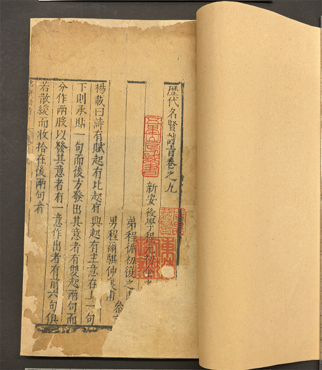 本次修复的两部古籍均具有极高的文献价值与历史意义。元至治元年(公元1321年)建安虞信亨宅刻本《楚辞集注》,为宋代大儒朱熹《楚辞集注》的早期重要刊本之一,刻印精良,是研究《楚辞》传播与宋元时期福建地区刻书业发展的珍贵实物。明刻本《历代名贤诗旨》,国内其他馆未见收藏,国外仅日本国立公文书馆有藏。历经数百年沧桑,两部古籍均出现了不同程度的虫蛀、老化、缺损、粘连等问题,亟待科学修复以延续其生命。