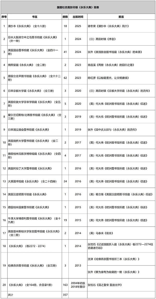 除了仿真影印,国图社出版的每一种《永乐大典》均邀请专家学者撰写前言,对所收录《永乐大典》的来源、价值等详细加以介绍。截至目前,国图社累计仿真影印出版海内外《永乐大典》357册,约占现存总量的81%。具体如下: