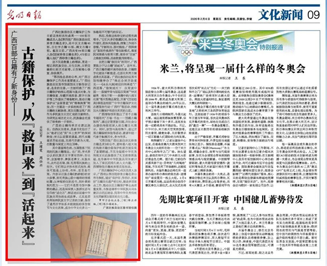 “第四批名录的公布,对广西古籍保护工作具有重要意义。”广西壮族自治区图书馆副馆长甘新告诉记者,名录的完善,一方面明确了广西古籍保护的核心范围与重点对象,为古籍修复、存藏环境改善、数字化保护等工作提供了精准靶向,推动古籍保护从“全面普查”向“精准施策”转变;另一方面进一步系统梳理了广西古籍的文献脉络,更加完整呈现广西作为多民族文化交汇地的文献特色,为研究区域历史文化、民族融合史提供了珍贵的一手资料。