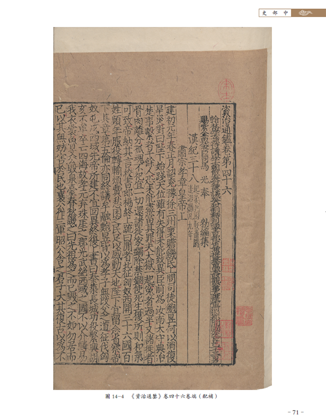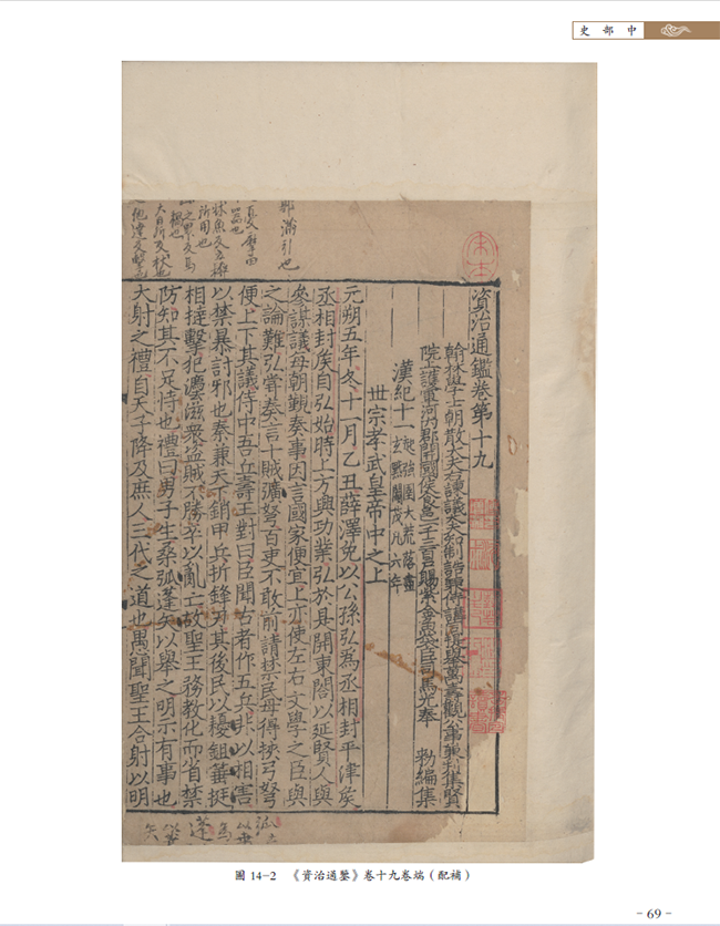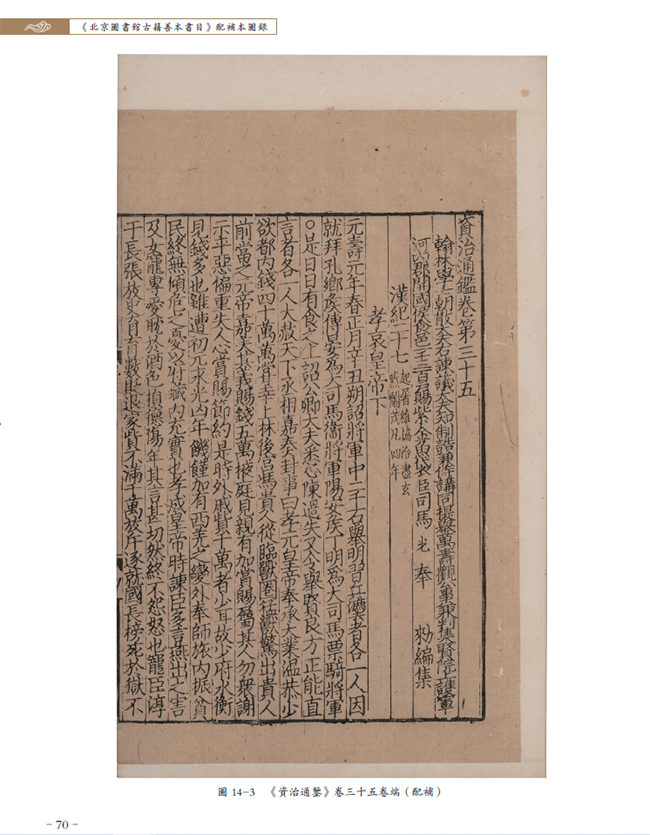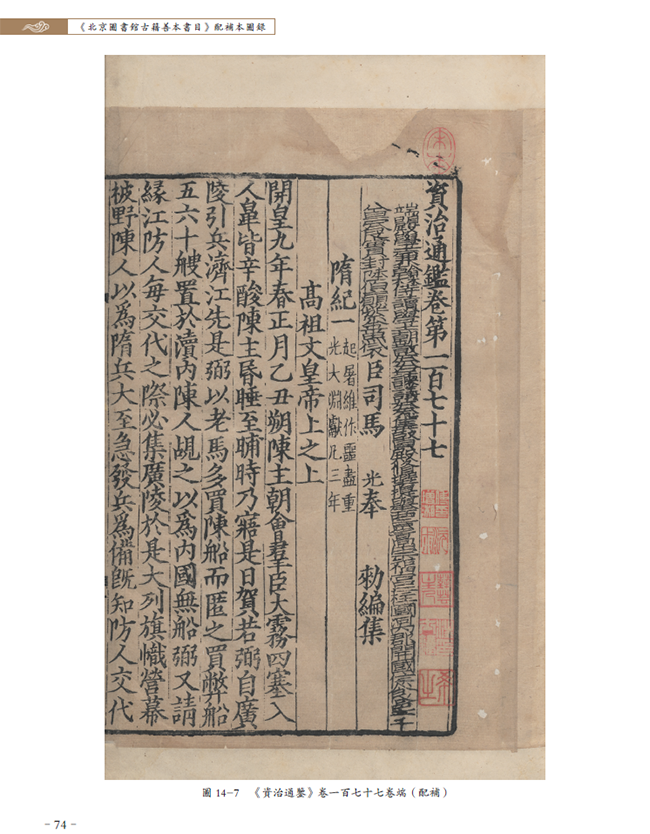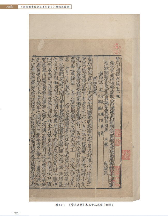 以史部宋绍兴二年(1132)至三年(1133)两浙东路茶盐司公使库刻《资治通鉴》(索书号:02461)为例,馆藏有两部:一部天禄琳琅旧藏,一部原藏傅增湘双鉴楼。本次详细著录的是傅氏双鉴楼之《资治通鉴》。《北图善目》仅著录为“配其他五种宋本”,本书提要将其配补卷析为其他六种宋本,并增补了两种抄本,每种版本标注版框尺寸,又将递藏脉络梳理清晰,整个版本情况较之以往的著录更加清晰,可以给使用者全景式的了解,便于进一步开展相关研究。