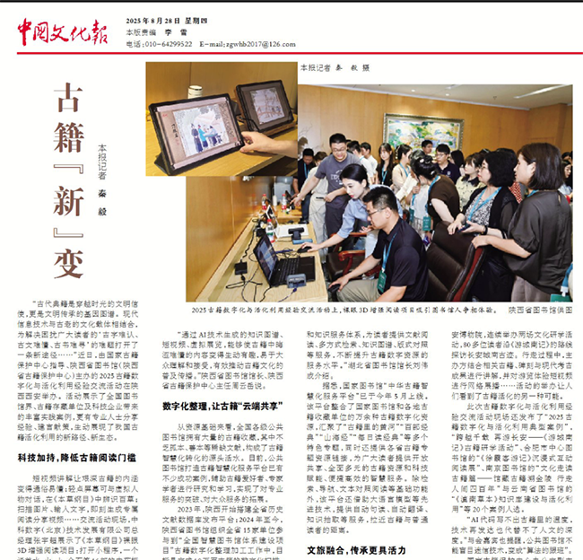 古代典籍是穿越时光的文明信使,更是文明传承的基因图谱。现代信息技术与古老的文化载体相结合,为解决困扰广大读者的‘古字难认、古文难懂、古书难寻’的难题打开了一条新途径……”近日,由国家古籍保护中心指导、陕西省图书馆(陕西省古籍保护中心)主办的2025古籍数字化与活化利用经验交流活动在陕西西安举办。