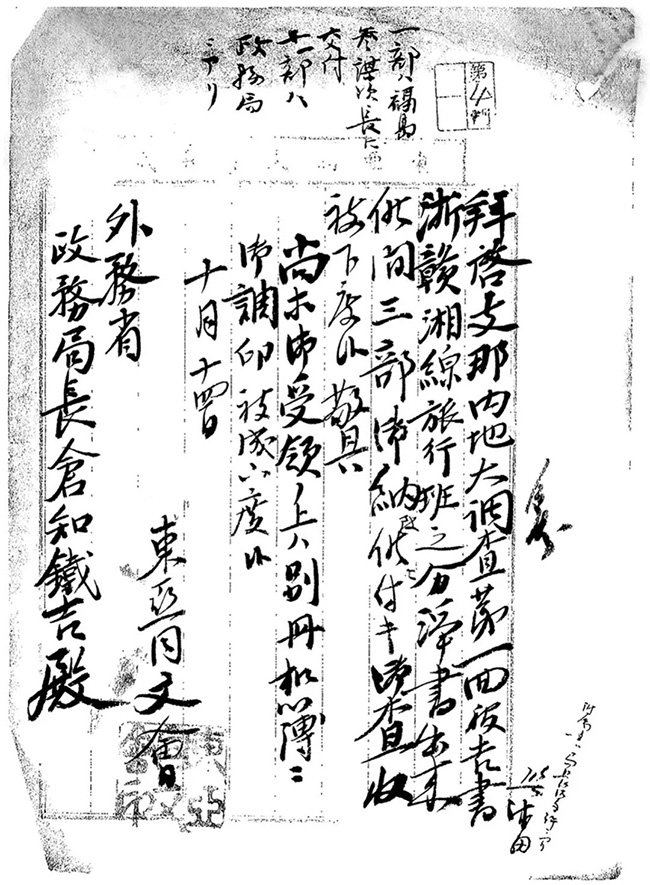 这就表明,报告书交付日本陆军,东亚同文会完全知情。进而可推论,“大旅行”在服务日本军事扩张方面没有藤田教授推想的那么保守(关于这一点,下文第三节还将补证)。同时,根津的报告还印证了书院“纪念志”中的说法:即报告书还会交给农商务省一部。前引1908年10月14日公函上的眉批之所以没有提及农商务省,应该是留在政务局的那一部报告书还未处理完成。而按外务省文书流转的常见过程,政务局处理完成后,会交给本省“通商局”进一步处理。该局处理完成,再转交农商务省是合乎情理的,毕竟报告书中有大量“商务”方面的内容。