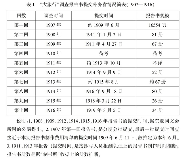 如果上述推断无误,则报告书在撰写阶段不可能制作“副本”。道理很简单,某一个调查班的手稿本由于是分头撰写,每部分的笔迹不同、工整程度不同、笔误多少不同。如果在这个阶段用复印纸制作“副本”,则每个“副本”都存在多种笔迹,无法做到整洁统一。这样的“副本”如何能提交给外务省等官厅?因此,前述针对毕业生的问卷中大多数人的回答是可靠的,即调查学生制作的报告书只有一部“正本”(即手稿本),并未复制任何“副本”。这一推测还可以从报告书手稿本的形成时间来做进一步考证。在1907年“营口班”提交的调查资料(调查报告书及“大旅行日志”)中,有“营口驻在班班长太田外世雄致东亚同文书院院长根津一殿。明治四十一年二月二十九日”字样。这表明报告书手稿本提交书院的时间是1908年2月29日。同年“京汉班”提交的调查资料中,与报告书同时提交的“卫生日志”封面上有“明治四十一年五月”字样。据此,该班报告书手稿本提交时间是1908年5月。按照惯例,“大旅行”是在每年的7月开始,10月前后结束。此后,调查学生在教师指导下整理材料、撰写报告书。考虑到报告书有代替毕业论文的用途,而书院每年的毕业典礼是在6月,上述两份报告书手稿本的形成时间应该具有代表性,即大多数调查书手稿本都是在调查活动结束后的第二年2—5月间撰写完成并提交书院。但据外务省档案,东亚同文会向该省提交“大旅行”调查报告书的时间,却往往是调查活动完成后的第三年,甚至更晚,详见表1: