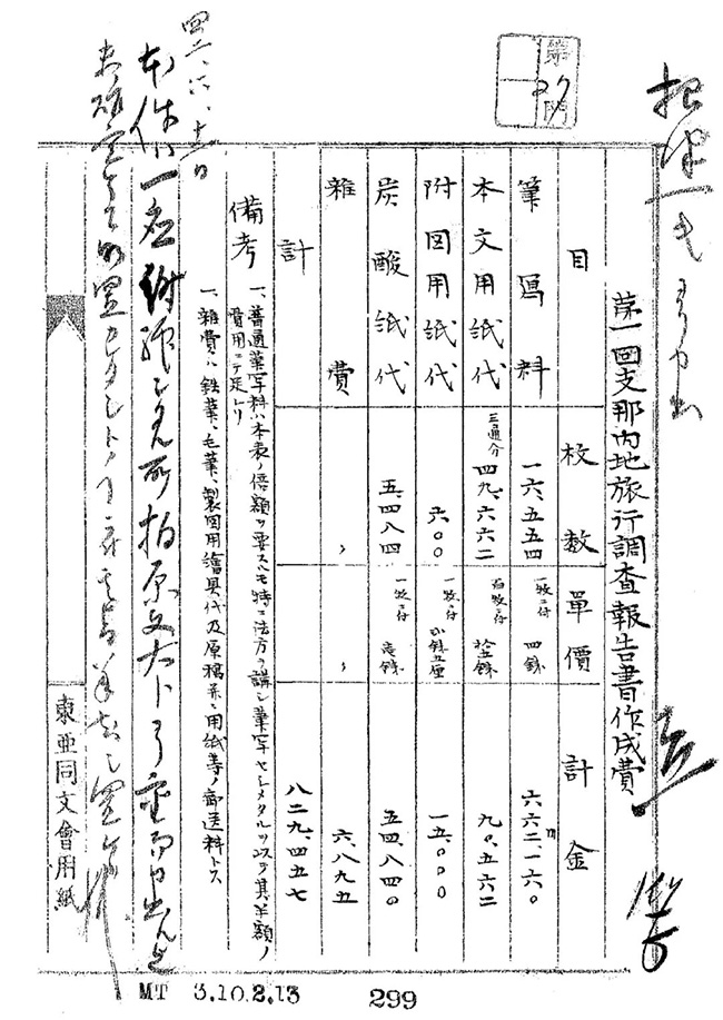 报告书在制作完“副本”后,自然要提交有关部门。这些部门到底是哪些?要解答这一问题,有必要对“副本”的数目做进一步探究。上文据根津一提交的第一回调查报告书制作费文书,得知复制的数目是3部(包含誊抄本在内)。但这3部有没有可能只是提交给外务省的“副本”数目,此外还有若干“副本”用来提交其他部门呢?笔者认为这种情况无法完全排除,但可能性甚小。第一回报告书的制作费是829.457元,按当时日本的物价水平,这是一笔很大的支出。当时,东亚同文会从外务省领取的“大旅行”经费是每年10000元,但这不包含报告书制作费。因此,这笔经费需要东亚同文会另筹。1909年4月,根津一为筹措第一回报告书的经费,向参谋本部第二部长宇都宫太郎求助,希望该部能提供800元的报告书“誊写费”。宇都宫再三设法,最后提供了500元,到当年11月才交付。可以想象,在3部800余元的制作费都如此难以筹款的情况下,东亚同文会如何制作更多“副本”?因此,第一回的报告书应该只有这3部。那么,第二回、第三回以及更晚报告书的“副本”数目会不会有所增加?1914年,东亚同文会获得外务省新一周期的补助金,“大旅行”经费增加到每年2万元。但同期因创办了“农工科”,学生人数增加,“大旅行”的花费更多,报告书制作经费依然不会宽裕。其次,前引报告书制作费“凭证”显示:截至1916年,制作人员的报酬一直没有变化。第一回报告书每页的抄写报酬是4厘,假如之后的报告书“副本”有增加,这意味着书写时要有更大的笔压(“副本”是通过复印纸制成,必须笔压足够才能文字清楚),抄写人员自然会要求更多的报酬,但这三年间这类报酬并未增长(日文3厘每页,中文和图表5厘每页,平均下来也仍是4厘)。同期,事务人员的每月津贴也未提高。报酬不变意味着工作量不变,因此每年复制的“副本”应该是相等的,即一直都是三部。那么,这三部是不是如东亚同文书院“纪念志”所说,分别提交给外务省、参谋本部、农商务省各一部?实情并非如此简单。