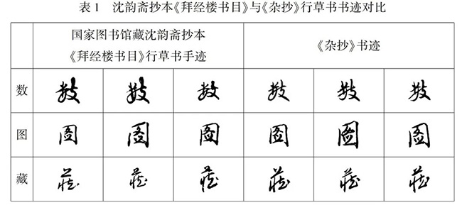 审《杂抄》书迹,乃出自同一人手笔,比对它与国家图书馆藏沈韵斋抄本《拜经楼书目》(索书号: 15585)中的常用字,行草书写法高度一致(例见表1),知《杂抄》出自沈韵斋之手。《杂抄》中多有沈韵斋涂乙改辨增补的字迹,加之钤有“感峰楼藏”印,知其应为沈韵斋的亲撰手稿,而非抄本。