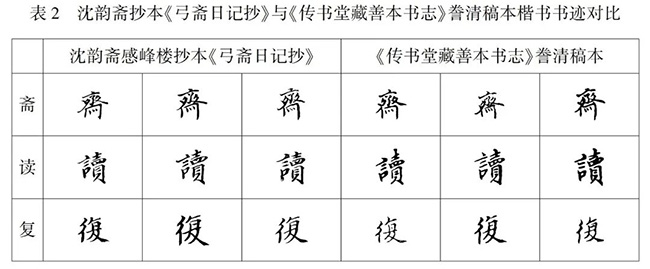陈力指出,这部誊清稿本“字体不一,显然抄录者较多,甚至一叶中之多篇书志即由不同人抄成”,检视确然。观察此本中诸人手迹,其中杂羼较多的一种楷书风格颇近沈韵斋,比照上海图书馆藏沈韵斋感峰楼抄本《弓斋日记抄》(索书号:线普长025914)中的楷书字迹,从结体到写法均相一致(例见表2),知系沈韵斋手迹,沈氏是《传书堂藏善本书志》誊清工作的主要参与者之一。