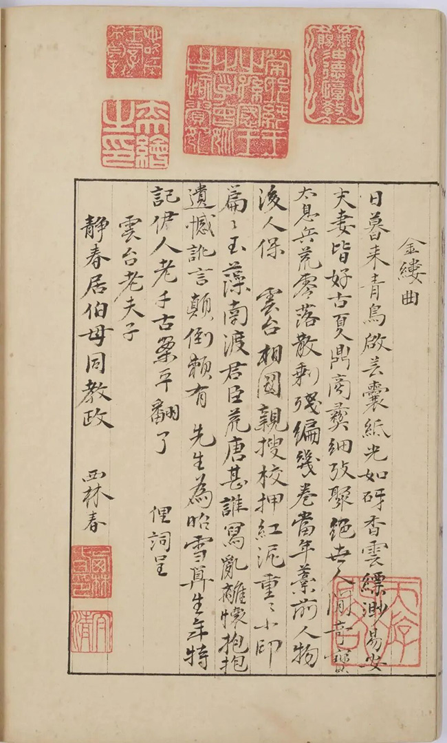 第三对夫妇是受到阮元的盛情邀约为这部宋刻《金石录》题识的清宗室多罗贝勒奕绘及其侧福晋顾太清。太清原姓西林觉罗,因祖父曾卷入文字狱,为避忌起见不得不改换姓氏。两人虽属青梅竹马,但历尽波折与抗争才缔结良缘,所以奕绘在婚后仍不断喟叹“当年尝遍苦酸辛”,“相看俱是梦中人”(《浣溪沙·题天游阁三首》其二)。奕绘博闻强识,尤擅诗词。顾太清的文学天分更加出色,甚至被后人拿来与纳兰性德相提并论,有“男中成容若,女中太清春”之说(冒广生《小三吾亭词话》卷一)。她还著有《桃花引》《桃园记》等剧本,并为《红楼梦》撰写过续书《红楼梦影》,在多个方面都展现出不同凡响的才华。夫妻俩在题识时一诗一词,分工明确。奕绘题写的一首七言古风,称羡阮元精研金石而得此宋椠善本,唯恐自己笔墨拙劣而难与诸家相称,最后以“愿公寿考如金石,宋录秦碑伴烟艇”作结,寄予了美好的祝愿。顾太清则填有一阕《金缕曲》,内容上与奕绘的诗作遥相呼应,着重称道阮元对此书的悉心呵护和深入考订。值得注意的是她在最后还提及李清照曾受“讹言颠倒”的困扰,幸亏阮、刘夫妇“算生年、特记伊人老”,才终于使得“千古案,平翻了”。