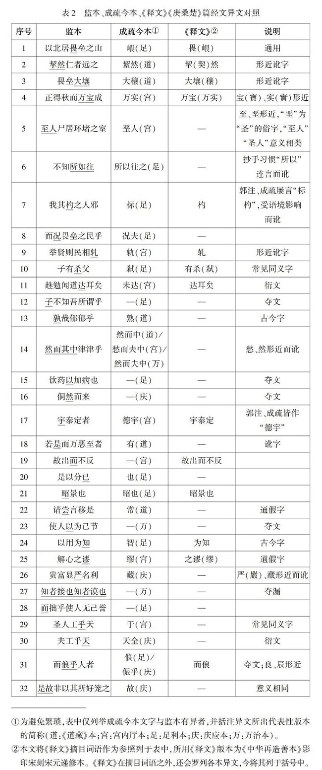 现存宋刻本《庄子》大致可以划分为两个系统,一种多用《释文》所见古字,另一种改古字为今字。除此之外,两种系统差别极小,实质性异文很少,与敦煌写本、高山寺本所存大量异文形成鲜明对比。这说明它们版本系统一致,当源于同一个祖本。北宋崇信道教,监本属于官方定本,由当时著名学者校勘,刊刻数年而成,质量优良,颁布后应会较快占据市场,挤压其他版本(尤其是写本)的生存空间,故而最终存留下来的本子,其底本(祖本)大概率为监本,即现存诸宋刻本的祖本很可能就是监本。因此,只需将成疏本经文与监本对比,即可验证上述推测。以《庚桑楚》为例,对比结果见表2: