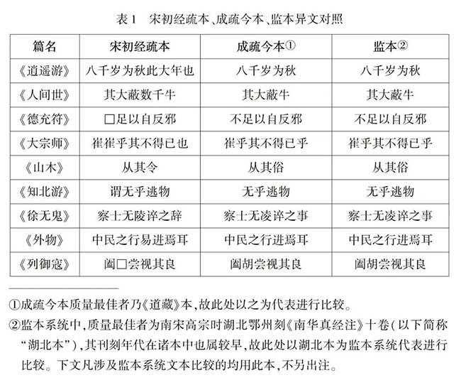 从成疏原本到早初经疏合抄本,再到经注疏合编本,成疏的文本形式不断变化。其间历经几百年,经文是否发生变化,也是需要关注的问题。成疏本之经文虽已难知全貌,但通过逆推疏文,可得部分面貌,这种方法王叔岷已有运用。笔者曾正王氏之误,补其不及,以诸宋刻本、高山寺本(残存七篇)、湖北本、疏文四者相对照,结果显示,成疏今本经文与逆推疏文获得的原本经文存在较大差异。因高山寺本残存七篇只是《庄子》三十三篇的一小部分,若高山寺本是一个足本,以之为参照,相信逆推疏文所得经文异文会更多。而逆推疏文寻求经文原貌这种方式本身也有局限性,只能推知经文的部分面貌,故成疏今本与原本之经文的差异还会更多。既然成疏今本属监本系统,则可知监本经文与成疏原本很可能存在较大差距。至于宋代所存张君房校经疏合编本,经文部分除了表1所列的异文之外,其余全同监本,而与逆推出来的经文同样存在较大差异,这说明此本距离成疏原本所依据的经文也较远。另外,成疏今本经文与疏文之间时有不相匹配之处,也可说明今本与原本之经文颇为不同。种种情况都指向成疏今本应为后人以别本(即北宋国子监本)经注匹配疏文而成。