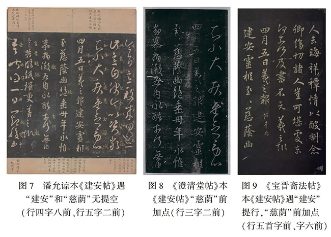 《淳化阁帖》祖本既有保存底本书迹平阙式者,又有改变书迹平阙式者。王羲之《建安帖》“建安灵柩至,慈荫幽绝,垂卅年”三句,《淳化阁帖》潘允谅本遇“建安”和“慈荫”两词并无提空(见图7)。核之《法帖释文》,此帖亦无空格和换行,可证《淳化阁帖》祖本并无提空。又据《淳化阁帖》祖本之底本重刻的《大观帖》,“慈荫”二字恰逢行首而无从判断,“建安”二字之前,亦不见提空。据《淳化阁帖》祖本重刻的《绛帖》,两处均无提空。二者均可证《淳化阁帖》祖本中《建安帖》并无提空。但是,同样摹入《建安帖》的《澄清堂帖》,于“慈荫”二字之上则有一点(见图8),以示尊敬;《宝晋斋法帖》除“慈荫”二字之上有一点外,遇“建安”二字尚有提行(见图9),且其尚存“僧权”押署,故颇存旧貌。