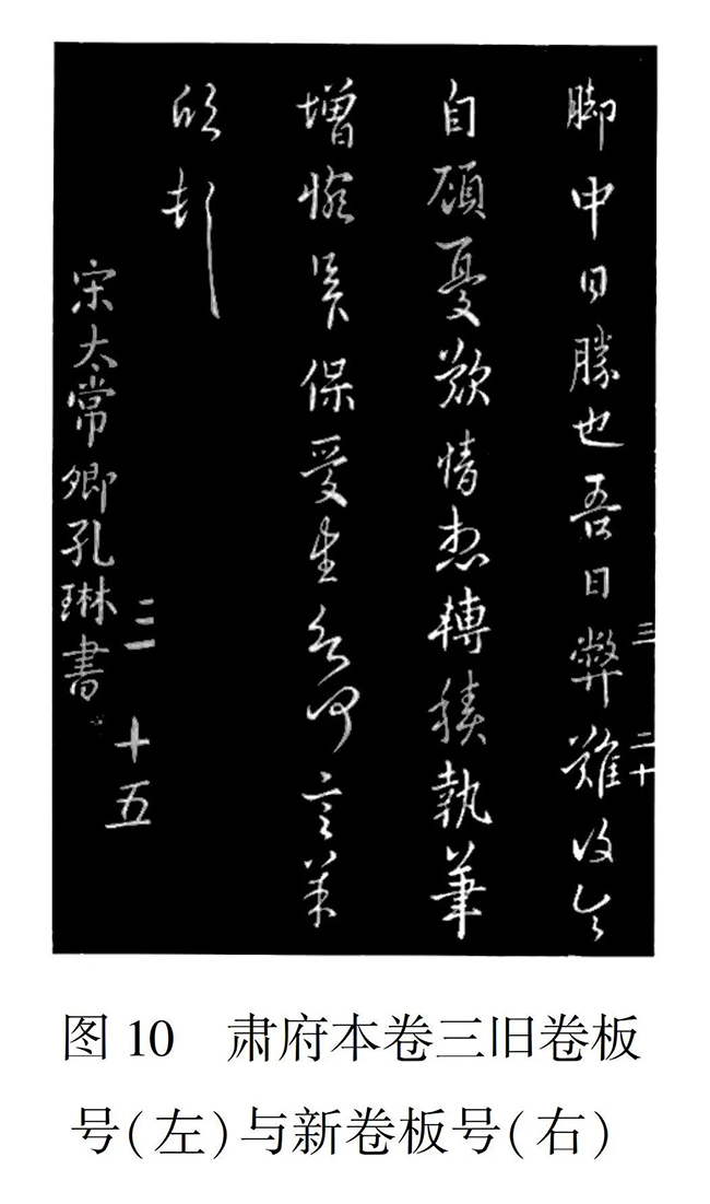 实际上,诸家对肃府本是否忠实于祖本存有争议。吴荣光跋《宋拓淳化阁帖》谓:“历来翻刻,卷数、板数只有肃藩本最准,今日较对无一不合。”陆心源则据“今肃本二百四十七版,比汪逵所记多六十三版”,认为“其非从淳化祖刊重摹可知”。若据刘克庄题跋,结合《淳化阁帖》传世诸本残存卷板号,则能进一步考索:其一,《淳化阁帖》在流布过程中存在残损与配补,导致帖板数量并不恒定,故仅以板数判定版本并不可靠。肃府本刻有两套卷板号,一袭自底本,一为肃府本新刻。两套卷板号位置稍有差异,数字次序亦不尽相同(见图10),可证肃府本在翻刻时并未严格遵循底本卷板号。其二,肃府本中混杂了不同版本。翁方纲于肃府本眉批云:“肃本此九卷(笔者按:即肃府本卷九),是别从一本摹入,以致过于细瘦。”仲威以肃府本卷九并未保留底本卷板号而其余九卷均有保留为据,亦判定“其卷九显然出自别本而独立其中”。其三,安思远本卷四、卷七和卷八,亦残存旧卷板号。其所存旧卷板号虽然数量不多,且与肃府本旧卷板号存亡情形不一,但其中有与肃府本完全相合者,故知其亦袭自《淳化阁帖》祖本。
