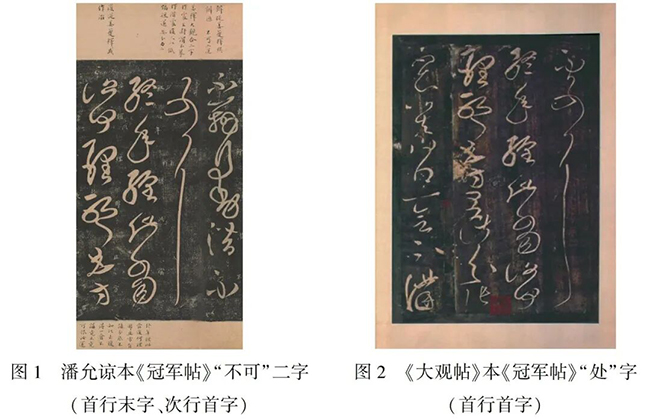 其一,《法帖释文》所释张芝《冠军帖》“不可”二字,潘允谅本(见图1)、肃府本、懋勤殿本、潘祖纯跋本均作“不可”,然《大观帖》(见图2)作“处”。