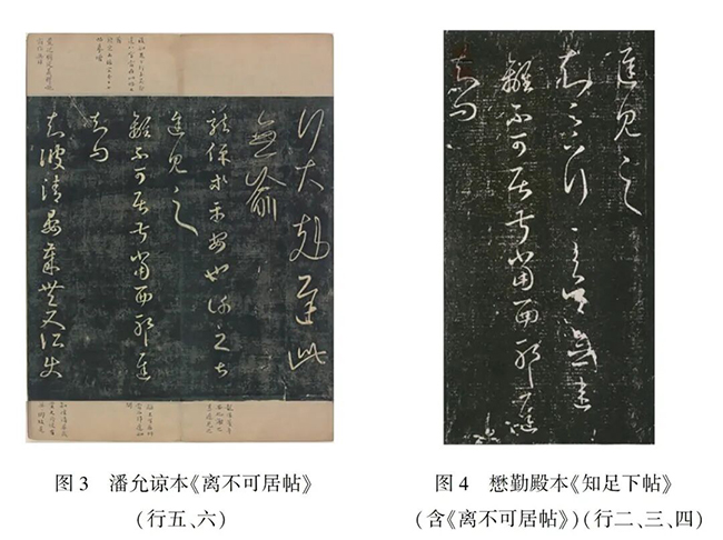 据以上分析可知,在《淳化阁帖》传世诸本中,潘允谅本、肃府本与《法帖释文》多能相合,颇能反映《淳化阁帖》祖本面目;懋勤殿本、潘祖纯跋本、浙图帖石与《法帖释文》颇有不合,应经过修锓。何碧琪曾“以传世宋拓校勘等方法,否定了潘祖纯跋本是修缮本之说”,认为“其年代早于佛利尔本(笔者注:亦称弗利尔本,即潘允谅本)亦无疑问”。此说颇可商榷。在《淳化阁帖》传世诸本中,懋勤殿本、潘祖纯跋本和浙图帖石无法准确断代,潘祖纯跋本有明万历三十四年潘祖纯跋,此外并无更早的年代信息及断代依据。另外,浙图帖石中存有多套卷板号,版本并不单纯;且其所收《知足下帖》(含《离不可居帖》和《爱为帖》),同处卷七最末一石,此石既倒置安装,又无卷板号,在全部帖石中显得较为特殊,乃其经过修锓之又一证。田振宇认为浙图帖石“存在参照馆本《十七帖》,对原有阁帖底本加以修缮的情况”。汪庆正则据银锭纹与绍兴国子监本的对应关系,排除了潘祖纯跋本属于祖本的可能性,判定其属于国子监本系统。若断以《法帖释文》,并印证以非《淳化阁帖》谱系的法帖或文献,即知懋勤殿本、潘祖纯跋本、浙图帖石既与《淳化阁帖》祖本存在差异,又与绍兴国子监本有不合之处,乃为修锓本。
