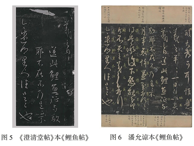 《法帖刊误》又谓:“《鲤鱼帖》‘敬’字、《行成帖》‘殷’字皆缺。”在《淳化阁帖》潘允谅本卷六《鲤鱼帖》中,“敬”字缺末笔(见图6);肃府本亦缺笔避讳。肃府本摹于明代,本无庸避宋讳,此字亦避宋讳,可证确袭自宋刻。然而,《澄清堂帖》本《鲤鱼帖》“敬”字则无缺笔(见图5)。《澄清堂帖》本《鲤鱼帖》颇存旧貌,证明早出书迹并不避讳,此讳应始于《淳化阁帖》祖本。至于《行成帖》之避讳,核之《淳化阁帖》传世诸本,潘允谅本、肃府本、懋勤殿本和潘祖纯跋本均未缺笔,与黄伯思所记不合;而出自《淳化阁帖》祖本的《绛帖》则缺末笔。究竟《淳化阁帖》祖本是否避讳,补证如下:《法帖释文》释此字为“殷”,并无缺笔。《法帖音释刊误》认为刘次庄释文有误,而释其为“列”。《行成帖》出于贾曾《饯张尚书赴朔方序》,文中即作“殷”,结合文义,知当以“殷”字为是。由于草书“列”字形近缺末笔的“殷”字,据此可确证《淳化阁帖》祖本《行成帖》“殷”字缺末笔避讳。