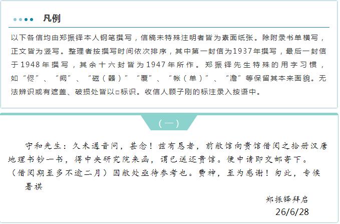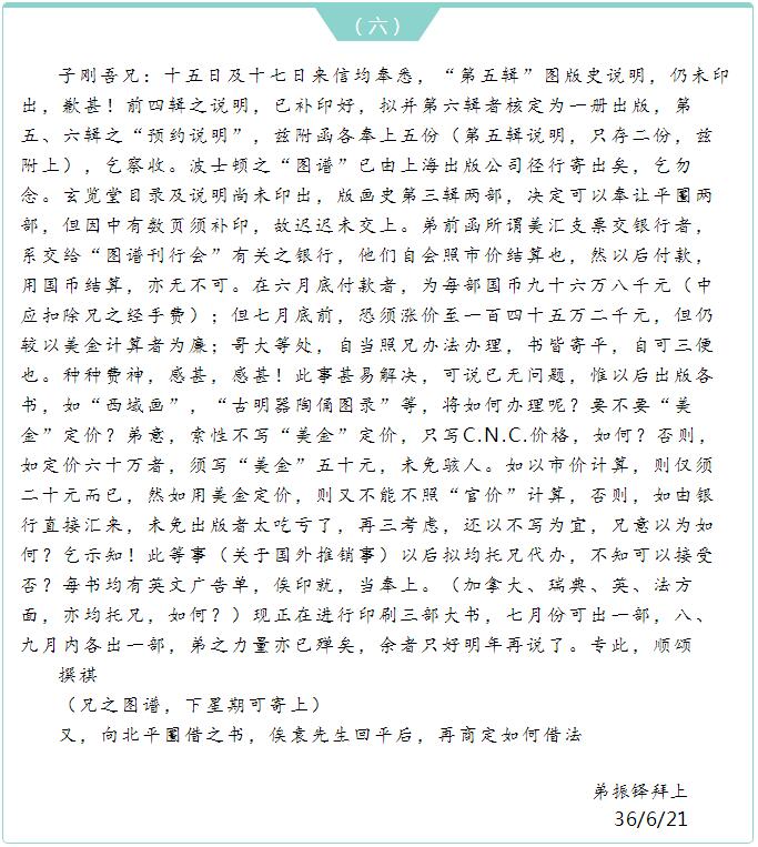 按:信的首页左上角印有1947年6月23日字样,应为收信日期。“图谱刊行会”应为中国历史参考图谱刊行会,抗战胜利后,郑振铎在方行、刘哲民等人支持下,邀集李健吾、王辛笛、徐伯郊、贾进者等十多位朋友各出资金,成立该会,募集的资金主要用于购置参考图书。“古明器陶俑图录”应为《中国古明器陶俑图录》,郑振铎生前并未出版该书,1952年6月16日郑振铎写给周恩来总理的信中称“因说明未写好,迄未出版”,后由上海古籍出版社1986年印行。“袁先生”即袁同礼,平馆馆长,时在上海养病。由该信所知,顾子刚(大同书店)业已协助郑振铎向美国高校销售图书,如《中国历史参考图谱》由上海直寄波士顿地区,而哥伦比亚大学亦有订购图书。