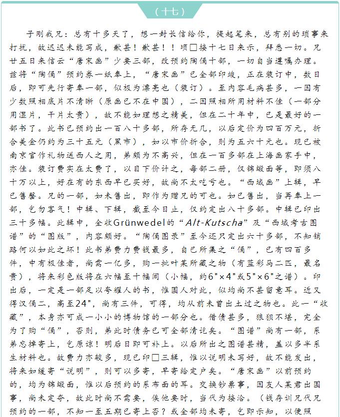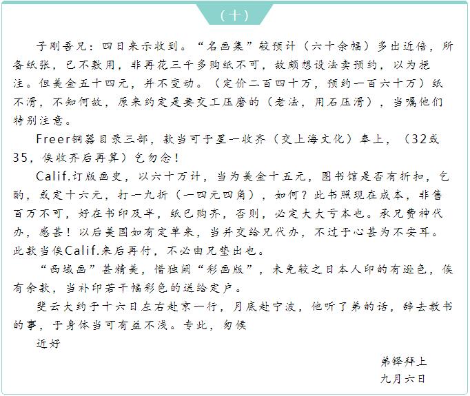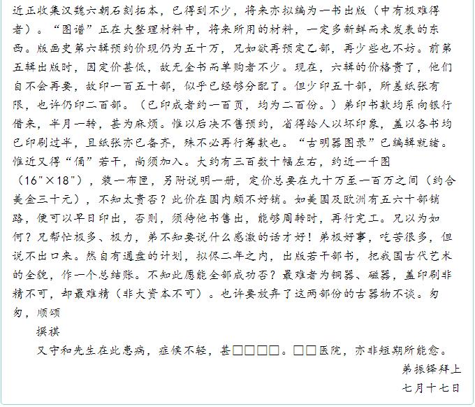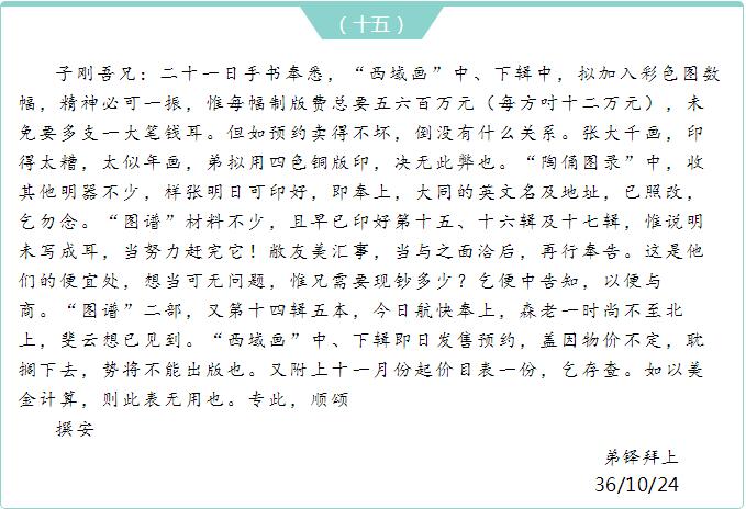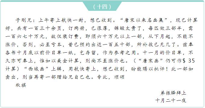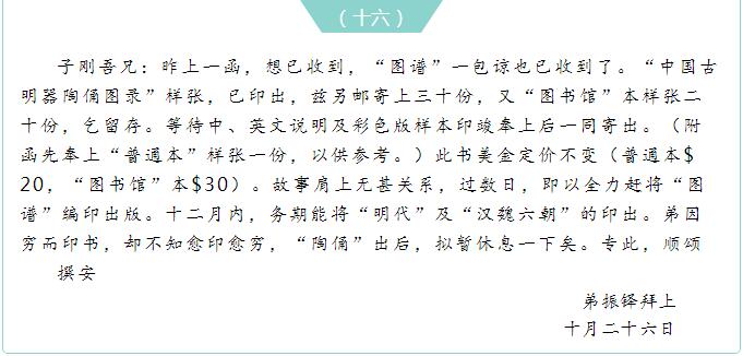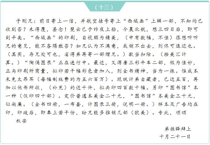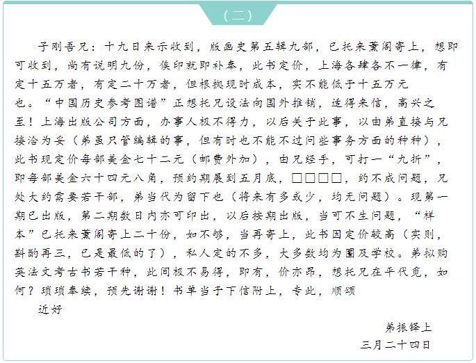 按:“版画史”应为《中国版画史图录》。《中国历史参考图谱》由郑振铎编,该书以历史脉络为序,共二十四辑,上海出版公司印刷并发行,由信中所言“每部美金七十二元”可知应指全集版本(布面函套装),虽书籍实体在1947年夏季发行,但亦提到“预约期展到五月底”。顾子刚负责经营的大同书店自1931年秋成立,至1947年已有十数年历史,虽然中间因抗战暂停了四年,但却与欧美公立图书馆、高校、研究机构建立了广泛且稳定的销售管道,这是郑振铎十分属意的,故极愿委托其代售其编辑出版的各类图谱、画册。查《郑振铎年谱》,可知该日他“写信十四封,均发出”,故笔者将此信系于1947年。
