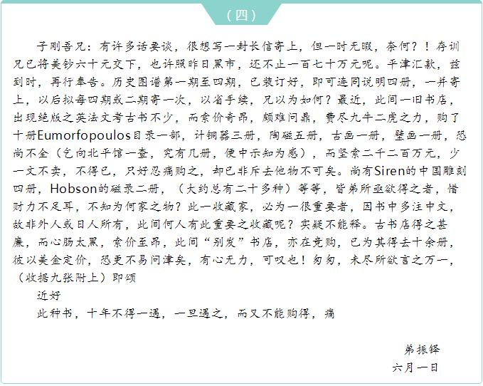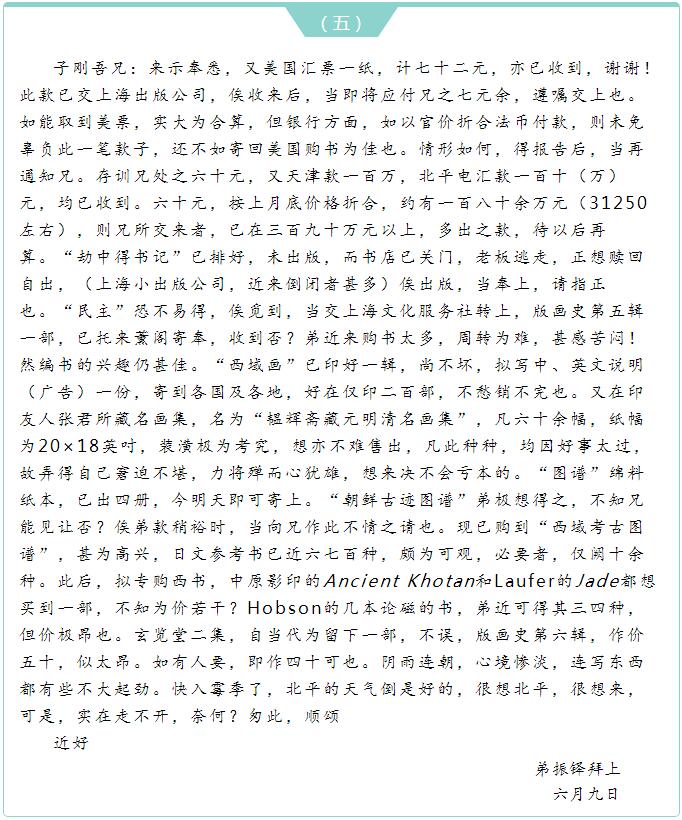 按:“存训兄”即钱存训(1910—2015),时将以平馆交换馆员身份到美国芝加哥大学图书馆工作和进修。Eumorfopoulos为乔治·尤莫佛里斯,1947年5月21日,郑振铎购到尤莫佛里斯目录十册。Siren为喜龙仁,“中国雕刻四册”似指Chinese Sculpture from the Fifth tothe Fourteenth Century(《中国雕塑》,1925年伦敦出版)。Hobson为洛克哈特·霍布森,编着有关磁器著述数种,较为知名者为The Ware of Ming Dynasty(《明代瓷器》,1923年伦敦出版),Catalogue of Chinese Pottery andPorcelain In the Collection of Sir Percival David(《大维德所藏中国陶瓷图录》,1934年伦敦出版)。“别发”即上海别发洋行(Kelly& Walsh Book Co.),著名的外文书店。