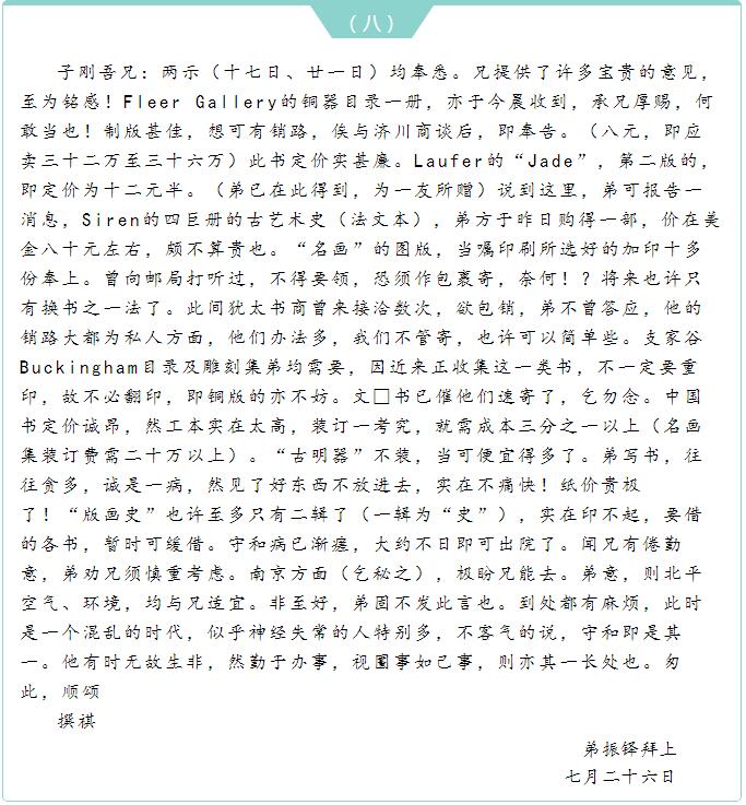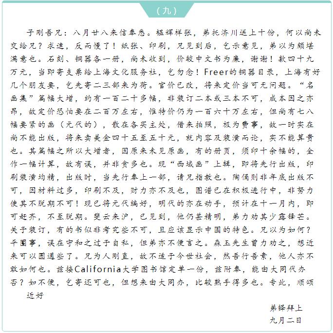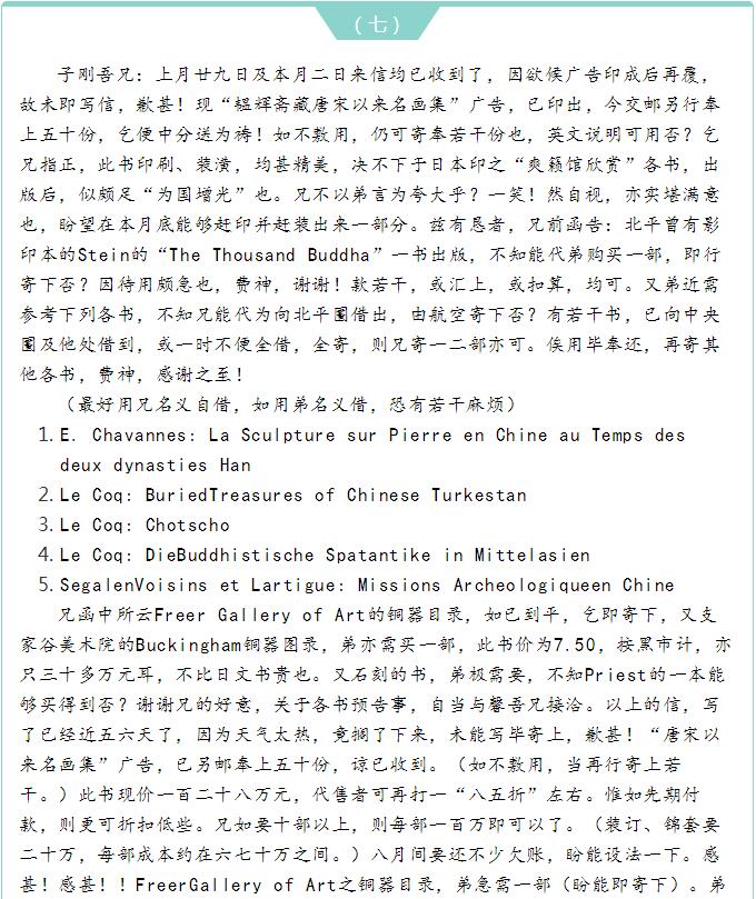 按:信的首页左上角印有1947年7月19日字样,应为收信日期。“爽籁馆欣赏”为日本实业家阿部孝次郎编,爽籁馆为其斋名,该书六册,分上下辑两函,收唐宋以降名画五十三件,1939年博文堂出版。“The Thousand Buddha”处顾子刚标注“影印是Ancient Khotan”,即郑振铎6月9日信中提及由“中原”(书店)影印者。“馨吾兄”指李芳馥(1902—1997),时任国立北平图书馆上海办事处主任。信中所提五部西文书依次为:沙畹《两汉时期的中国石刻》、勒柯克《新疆的地下文化宝藏》、勒柯克《高昌:吐鲁番古代艺术珍品》、勒柯克《中亚古代佛教艺术》、谢阁兰等《中华考古图志》。“FreerGallery of Art的铜器目录”应为ADescriptive and Illustrative Catalogue of Chinese Bronzes(《中国铜器图录》,1946年华盛顿出版),该书为弗瑞尔美术馆(FreerGallery)东方研究丛书(Oriental Studies)第三种。“支家谷美术院的Buckingham铜器图录”应为Chinese Bronzes from the BuckinghamCollection(《白金汉所藏中国铜器图录》,1946年芝加哥出版),该书为陈梦家与芝加哥艺术学院博物馆合编,所收录的铜器皆为Buckingham收藏。