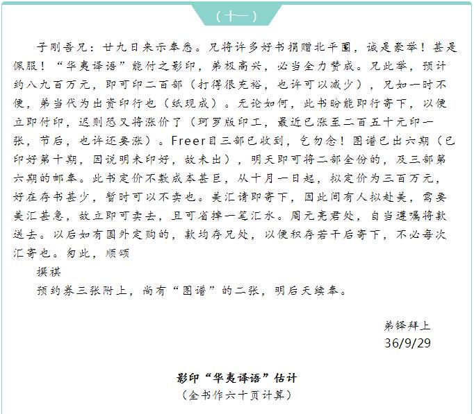 按:首页左上角印有1947年10月1日字样,应为收信日期。顾子刚捐赠图书一事,可参见“顾子刚先生捐赠本馆图书目录”。《华夷译语》由明太祖朱元璋敕撰,火源洁、马沙亦黑等编纂,该书将汉字译成蒙古文字,是中国历史上第一部汉蒙字典,但本次影印计划似并未完成。“周元亮”似非画家者,其将赴美国,参见下封信内容。