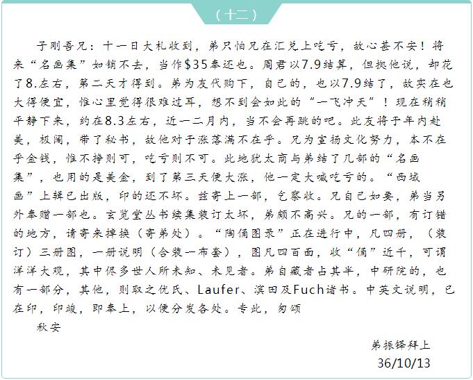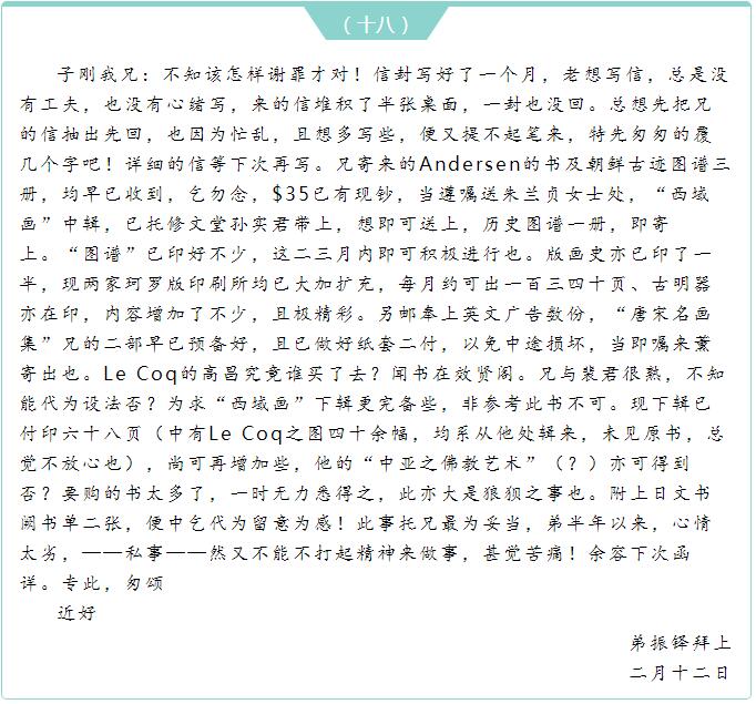 按:根据信中内容可知,此时“西域画”中辑已出版,依照前信和《郑振铎年谱》可知上辑约在1947年秋出版,因此笔者认为此信为1948年2月12日所写。“Andersen”者不可考。朱兰贞应为陆梅僧的夫人,时任上海著名的圣玛利亚女校校长。孙实君为修文堂老板,解放后为上海古籍书店的首任经理。“LeCoq”为德国探险家阿尔伯特·冯·勒柯克,信中所指“高昌”应为Chotscho: Facsimile-Wiedergaben derwichtigerenFunde der erstenköniglichpreussischen Expedition nach Turfan inOst-Turkistan(《高昌:吐鲁番古代艺术珍品》,1913年柏林出版)、“中亚之佛教艺术”应为Die Buddhistische Spätantike in Mittelasien(《中亚古代佛教艺术》,1922-1926年柏林出版)。效贤阁裴君应为店主裴连顺。