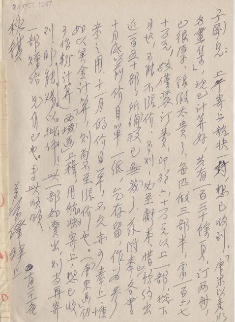 按:信的首页左上角印有1947年10月27日字样,应为收信日期。“大同的英文名”应为PekingUnion Bookstore,此时对外地址应为国立北平图书馆馆址。十一月价目表不存。