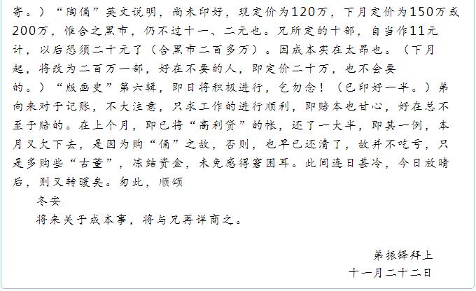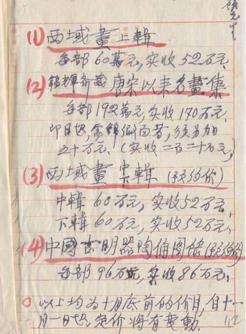 按:信的首页左上角印有1947年11月23日字样,应为收信日期。郑振铎在首页上部补记:(“唐宋画”定价$54,决不改动,惟给兄作为$35耳)。Grünwedel为阿尔伯特·格伦威德尔,“Alt-Kutscha”为《古代龟兹》(1920年柏林出版)。“叶某”应指叶恭绰,1947年郑振铎数次至法宝馆(拜访叶恭绰),如1月6日、1月7日、4月8日、5月26日。
