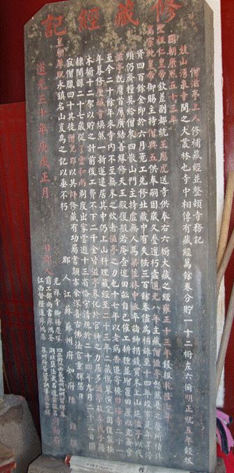 在涌泉寺众多的修复者中,最有影响并且留下碑文记录的就是滋亭通雨大师(?—1844)。据《修藏经记》记载, 面对破损、虫蛀的藏经,主藏僧滋亭于道光八年(1828)六月用自己多年积攒的四百余金钵资,聘请良工先修《永乐北藏》,至道光十四年(1834)修复完成300多卷。后遇福州旱涝频繁,斋粮匮乏,僧众星散,滋亭上人义无反顾,担当住持,广结善缘,修天王殿、般若庵,增置田产,雇工耕种,斋食丰盈。三年之后,寺院再复生机,即以老病告 退,专心整理修复藏经。至道光二十三年(1843)完成了《永乐北藏》《龙藏》的修复工作,并花费二千余金,制作十二个楠木经橱。滋亭上人次年圆寂,为修复藏经奉献一生。