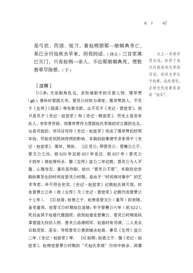 《赵氏孤儿》杂剧,《增补本录鬼簿》录其题目正名为“义逢义公孙杵臼,冤报冤赵氏孤儿”。这是春秋时代发生在晋国的一个著名故事。该故事的蓝本见汉司马迁《史记·赵世家》(汉刘向《新序·节士》《说苑·复恩》分别做了节录,可视为该故事的转写与流传已于汉代开始),讲述晋国政权内部的一场生死倾轧:故事的反面人物是受到晋灵公宠幸的屠岸贾,正面人物是推翻了晋灵公而拥立晋成公的赵氏家族。晋国大夫屠岸贾得势,气焰嚣张,排挤政敌,擅自带领诸将攻灭赵氏,赵氏全族惨遭杀害。而在赵氏家族中,赵朔的妻子是晋成公之姊,她在赵朔死后隐匿宫中,产下遗腹子,即“赵氏孤儿”。屠岸贾派人到宫中搜索,未果;而孤儿已经秘密交托与赵朔的门客公孙杵臼及赵朔友人程婴。二人合计,谋取别人家的婴儿,由公孙杵臼佯作抱养;程婴依计假装出首“告发”公孙藏匿“赵氏孤儿”,公孙及别家婴儿均被杀害,而程婴则担负起养育赵氏孤儿的重任。屠岸贾遂以为赵氏家族已经“绝种”。而程婴在日后的漫长岁月里含辛茹苦,抚养赵氏孤儿成人,取名赵武。后来,晋景公得病,疑神疑鬼,问及赵氏后人,得知赵氏孤儿尚在人间,在同情赵氏的晋国大将韩厥等人的劝说下召见赵武、程婴。其后,赵武与诸将一起灭了屠岸贾家族。等到赵武20岁时,程婴自感职责已尽,自杀身亡,期待与当年就义的公孙杵臼相会于黄泉之下。赵武为之服丧三年。由此可见,这个故事的主旨本来侧重于讲述晋国的两个权贵家族的“私斗”。而在此“私斗”中,公孙、程婴二人身上的“门客义气”备受关注。