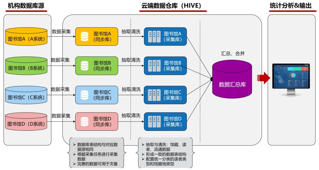 构建了多馆多源大数据采集、清洗软件体系,协调发动全省市、县、乡镇图书馆参与大数据建设工作,到2023年底共采集汇聚全省图书馆有效数据7亿条,平均每天以18万条增长。其中:采集到112家图书馆业务管理系统的读者数据2485万条、馆藏数据1.2亿条、外借数据5.5亿条;采集到全省五级18196个图书馆(室)的填报数据500余万条;采集到79家图书馆的读者活动数据1万多条;采集到全省107家图书馆的读者到馆量数据162万条。此外,还购买了标准书目数据322万条,在版编目(CIP)数据60万条。形成了目前国内范围最广、类型最多、总量最大的公共图书馆大数据仓储。