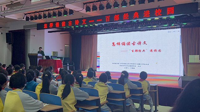 2023年5月4日,由国家图书馆《中华传统文化百部经典》编纂工作办公室主办的《百部经典》进校园系列宣传活动走进北京市平谷区金海湖学校,向同学们介绍经典普情况及古诗文阅读方法。编纂工作办公室主任张洁出席活动并致辞。