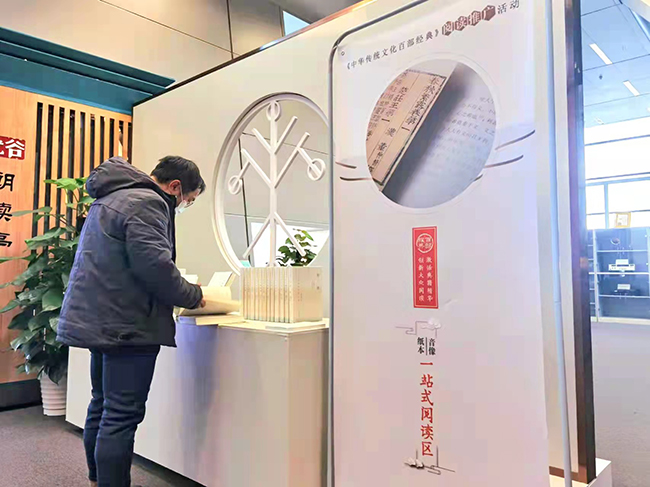 为便于读者来馆阅读,国家图书馆《中华传统文化百部经典》编纂工作办公室设立专题书架,提供专门阅读区域,宣传普及《百部经典》。