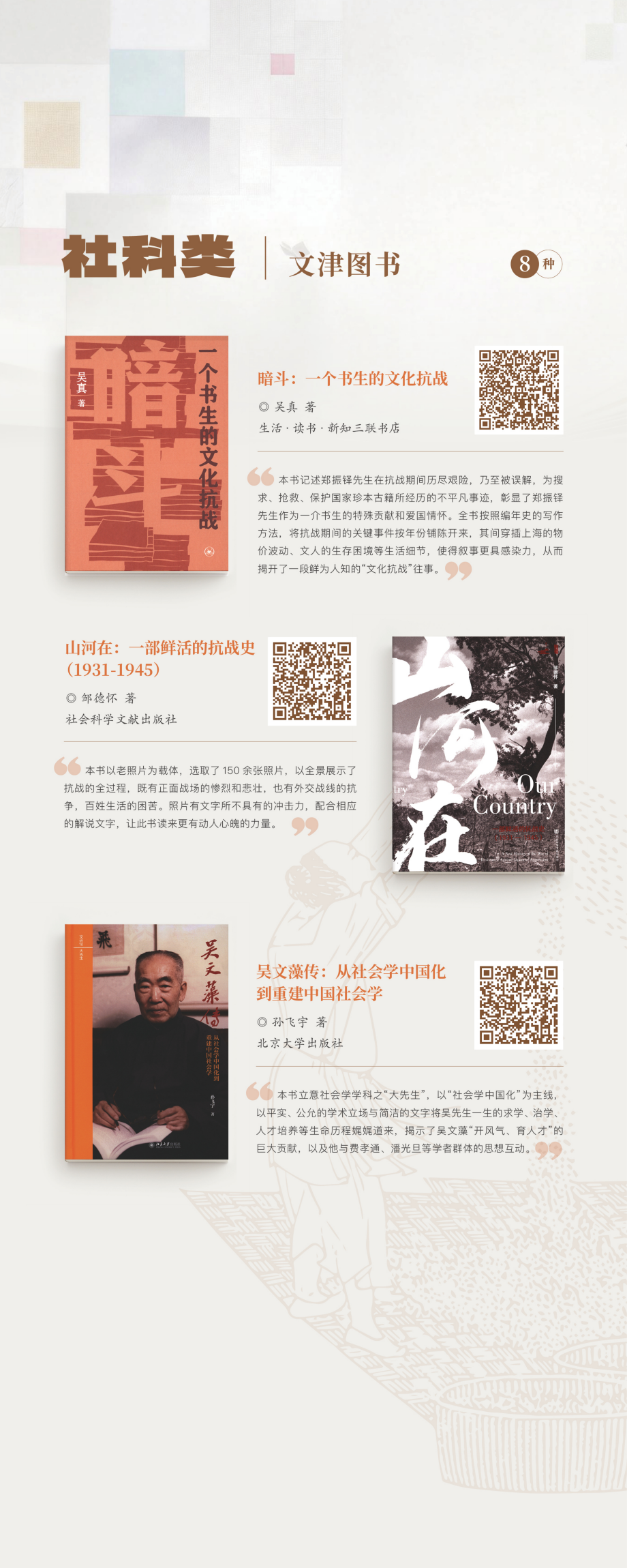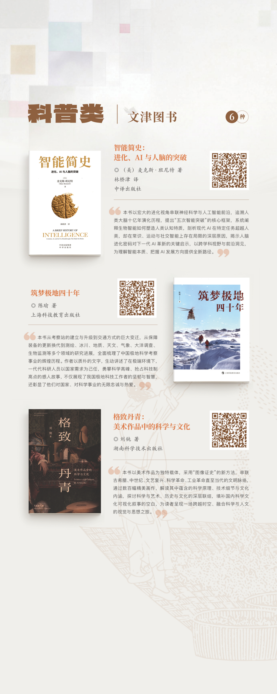 从二十载深耕不辍到二十一届再踏新途,文津图书始终与全民阅读同频、与时代发展共振。第二十一届文津图书涵盖中华优秀传统文化、抗战历史、前沿科学知识、少儿成长教育等多元领域,满足了不同群体的阅读需求,为全民阅读提供了精准、优质、丰富的内容支撑,彰显了全民阅读的责任担当。其中,如社科类文津图书吴真的《暗斗:一个书生的文化抗战》以郑振铎等知识分子在烽火岁月中抢救古籍、守护文脉的真实历程为叙事主线,以扎实史料与细腻笔触,生动诠释中华文脉不绝、民族精神不灭的深刻内涵。科普类文津图书陈瑜的《筑梦极地四十年》从考察站的建立与升级到交通方式的巨大变迁,从保障装备的更新换代到测绘、冰川、地质、天文、气
