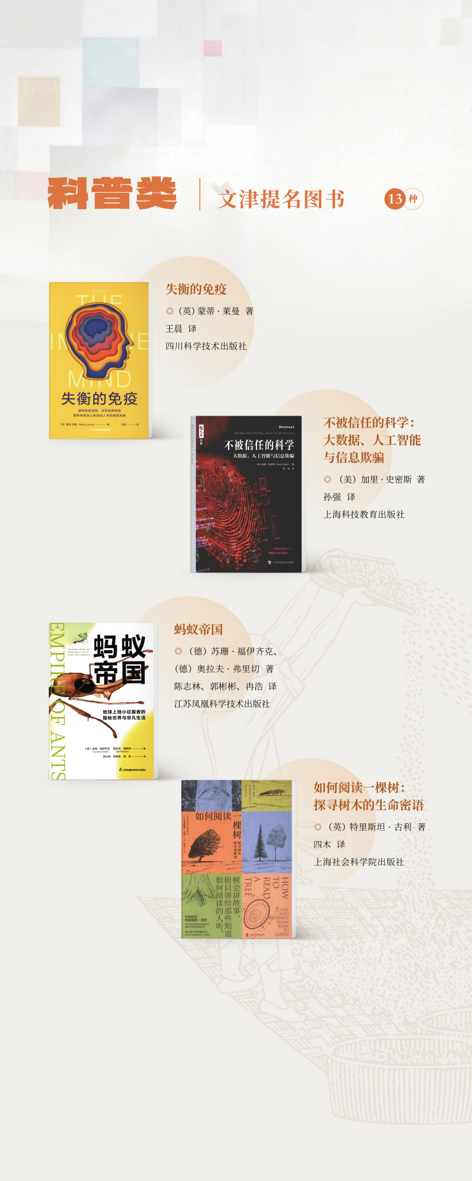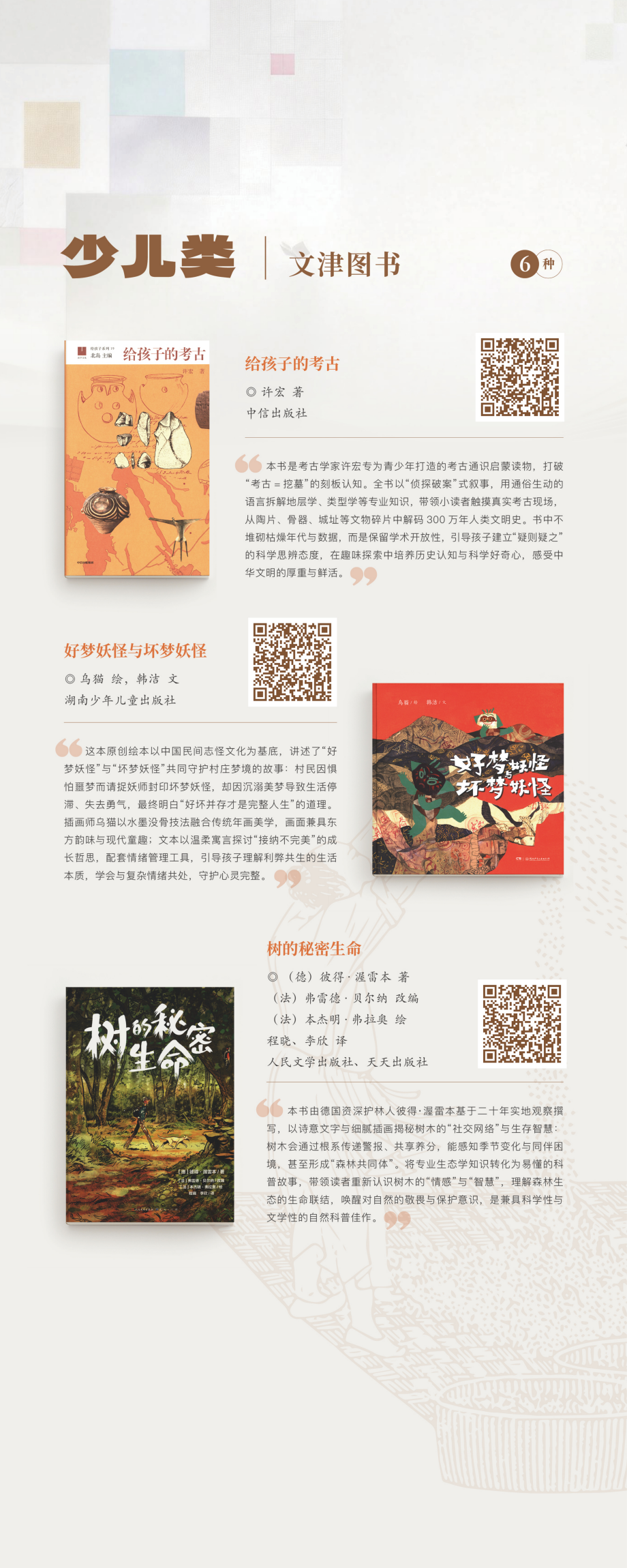 象、大洋调查、生物监测等多个领域的研究进展,全面梳理了中国极地科学考察事业的辉煌历程。少儿类文津图书许宏的《给孩子的考古》以考古学家专为青少年打造的通识读本为启蒙载体,以“破案”式叙事与通俗笔触,生动诠释了历史认知与科学好奇心共生的探索精神。一本本好书,皆是时代的印记,文化的载体,更是文津图书评选对全民阅读责任的生动践行。